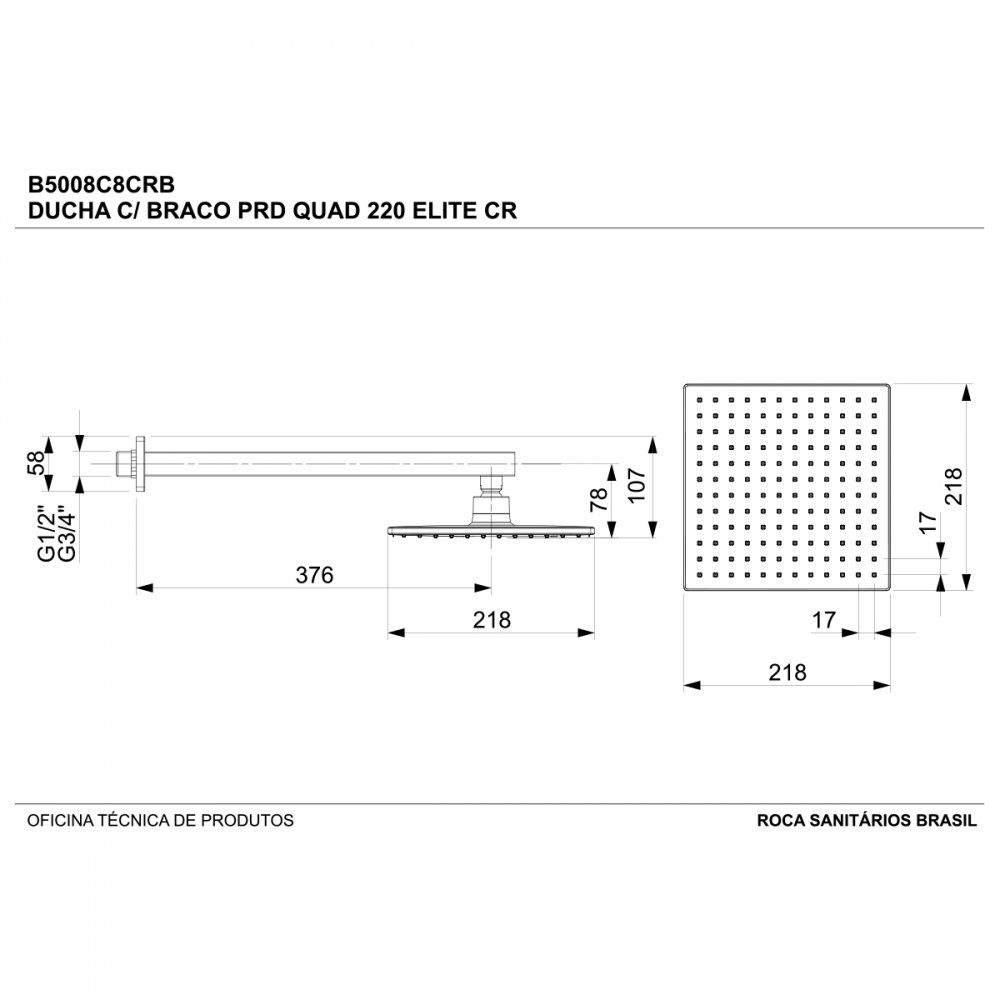 Chuveiro com Braço Parede Quadrado 200 mm Elite Celite